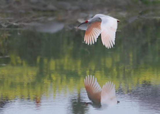 朱鹮非繁殖期通體白色,頭、羽冠、背和兩翅及尾綴有粉紅色。翅下和尾下亦綴有粉紅色,飛翔時極明顯可見。最外側飛羽幾全暗褐色,僅基部的內外緣以及羽干白色。