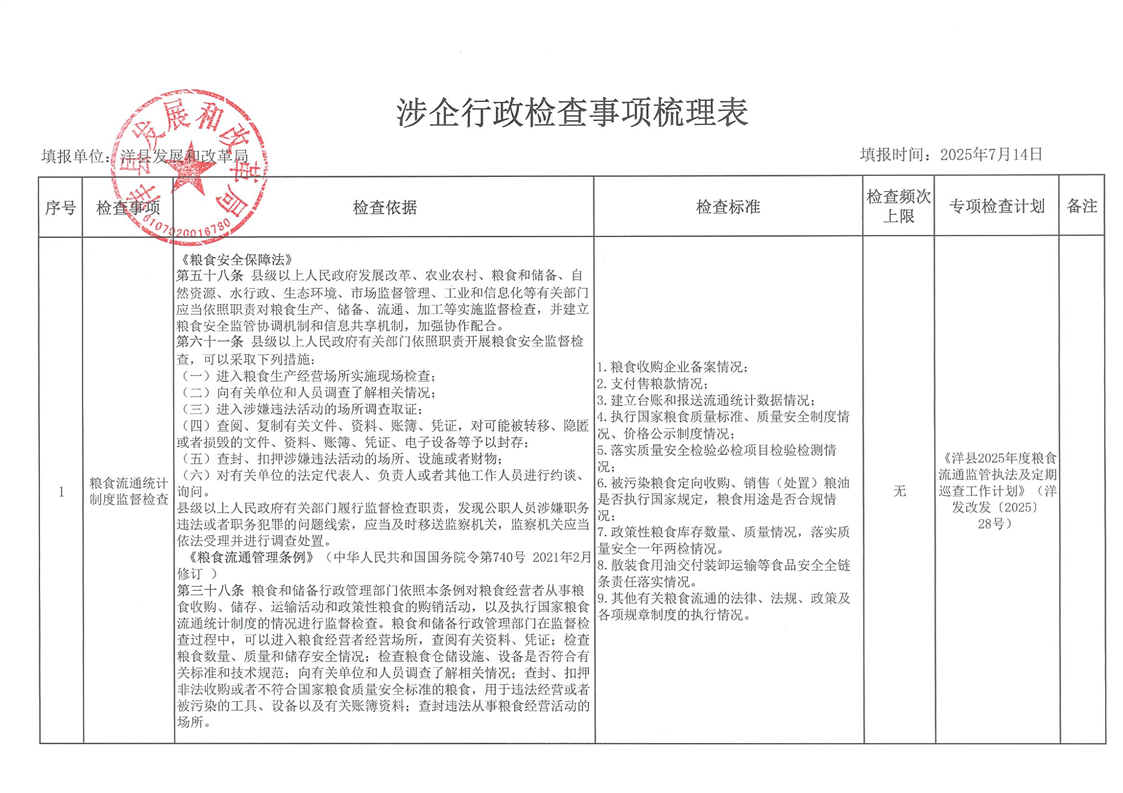 洋縣發展和改革局涉企行政檢查事項梳理表