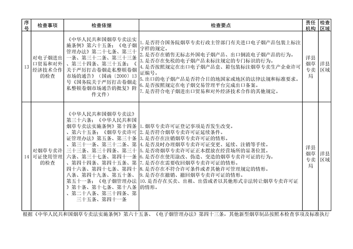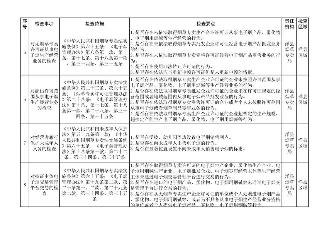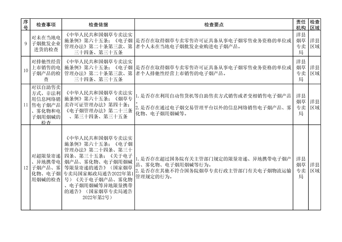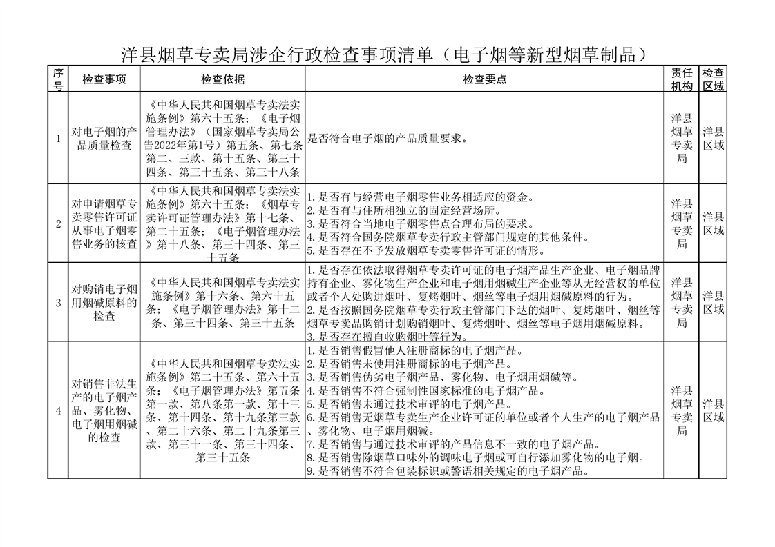 洋縣煙草專賣局涉企行政檢查事項清單(電子煙等新型煙草制品)