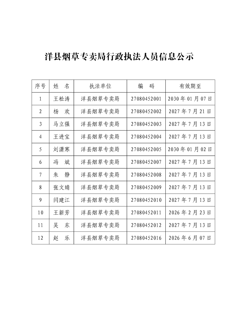 洋縣煙草專賣局行政執法人員信息公示
