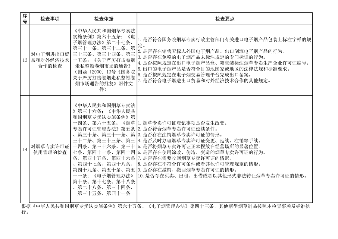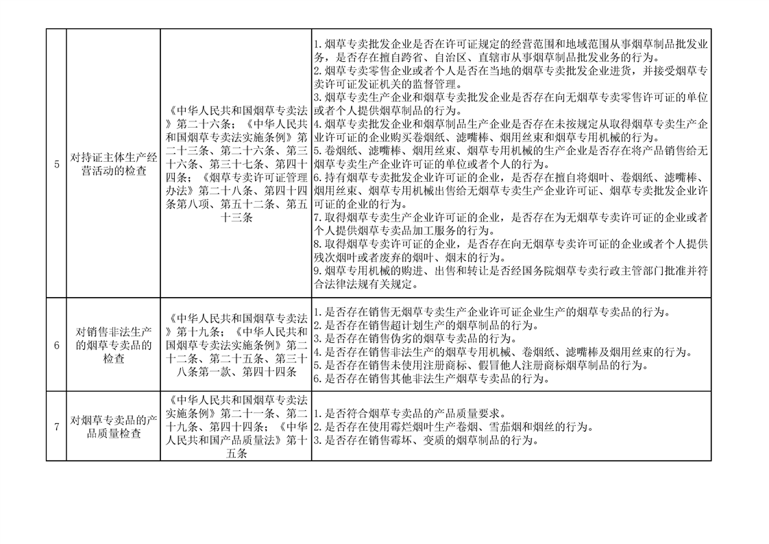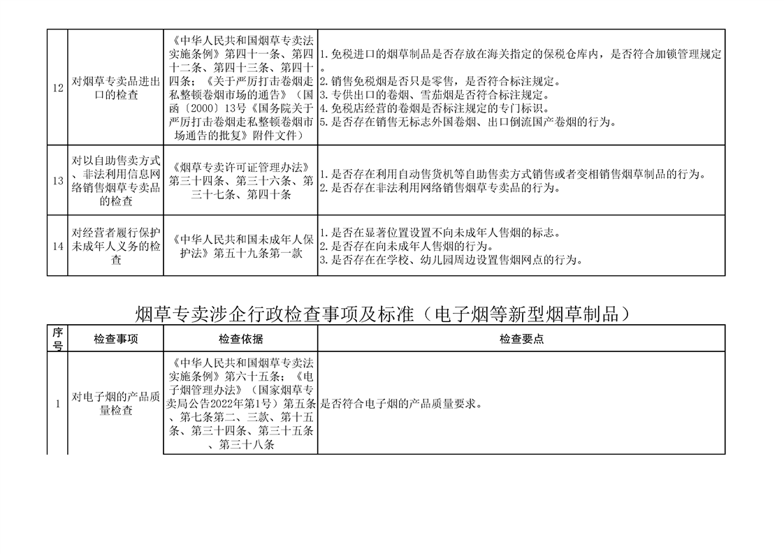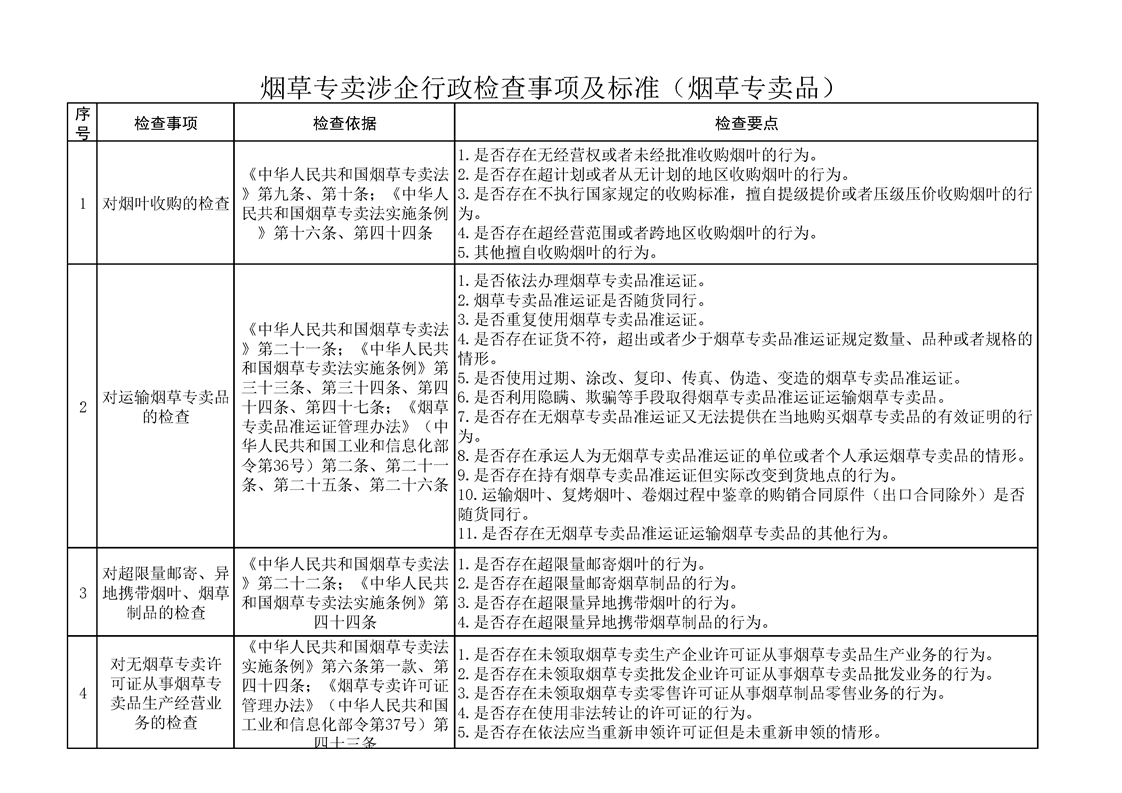 煙草專賣涉企行政檢查事項及標準