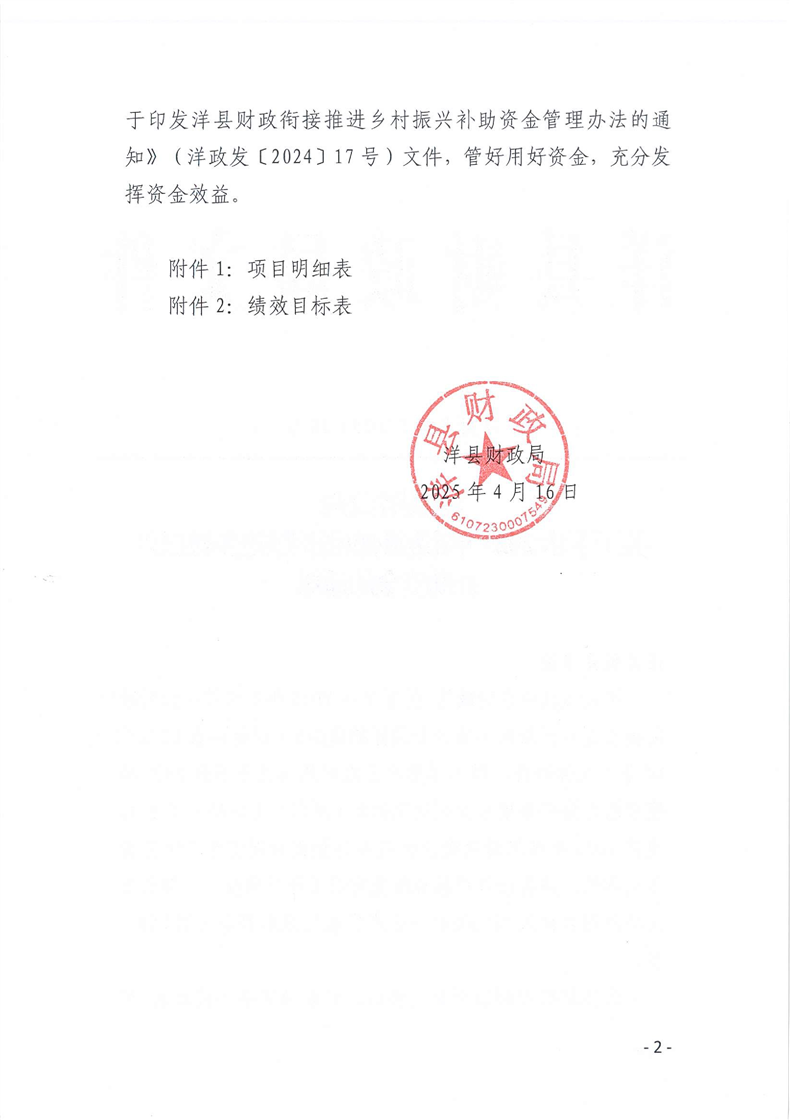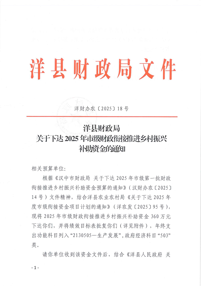 洋財辦農(2025)18號 洋縣財政局關于下達2025年市級財政銜接推進鄉(xiāng)村振興補助資金的通知