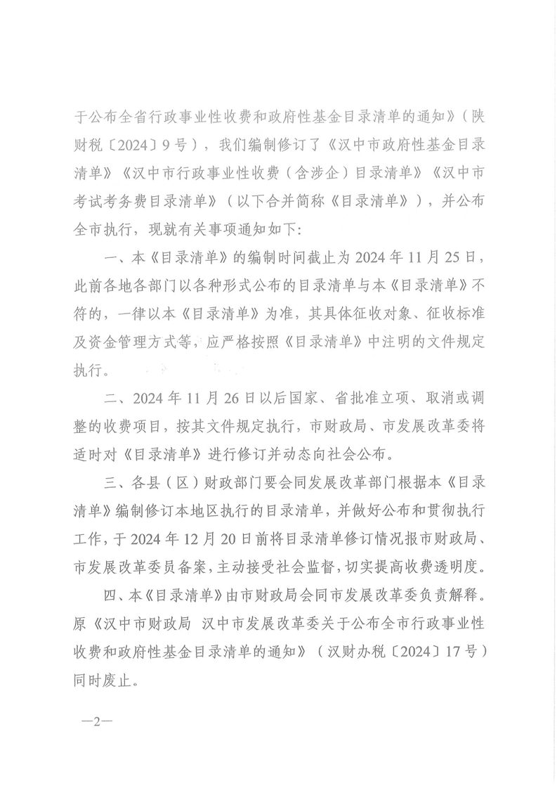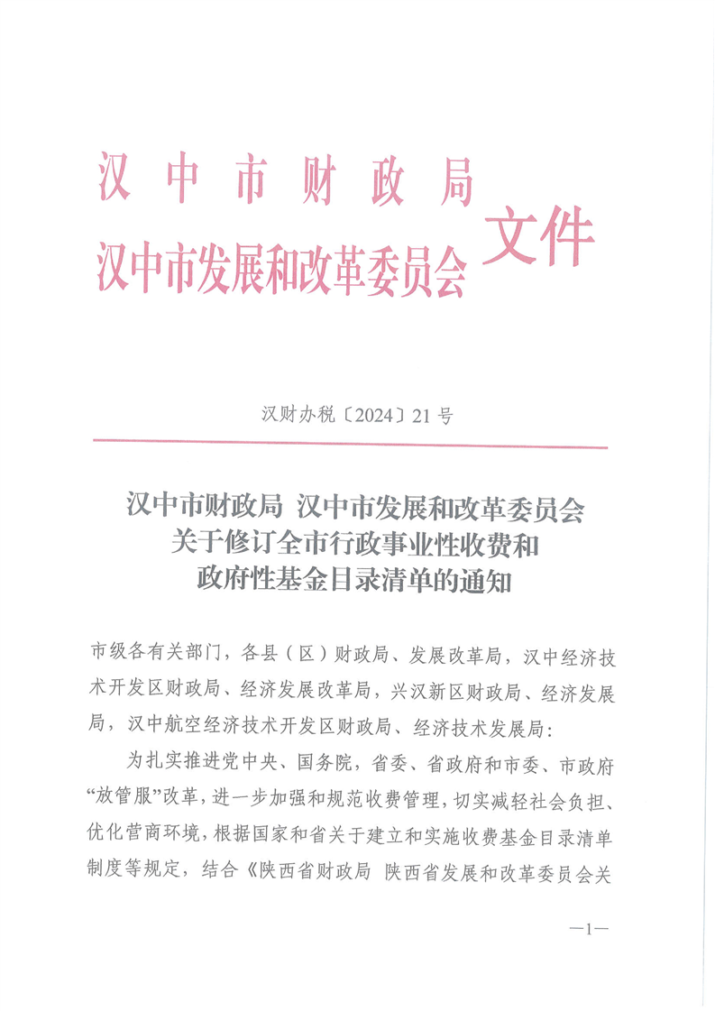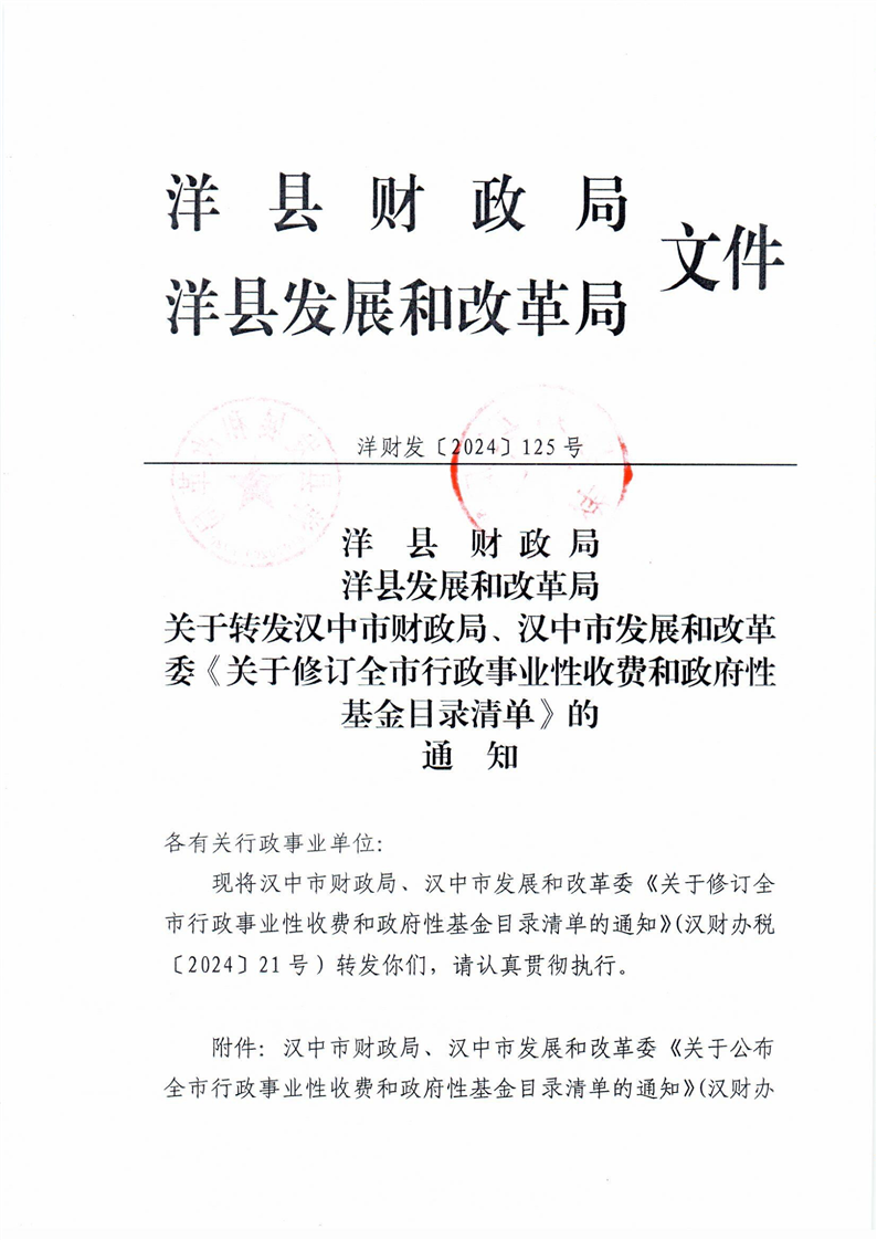 洋縣財(cái)政局 洋縣發(fā)展和改革局關(guān)于轉(zhuǎn)發(fā)漢中市財(cái)政局、漢中市發(fā)展和改革委《關(guān)于修訂全市行政事業(yè)性收費(fèi)和政府性基金目錄清單》的通知 洋財(cái)發(fā)【2024】125號(hào)