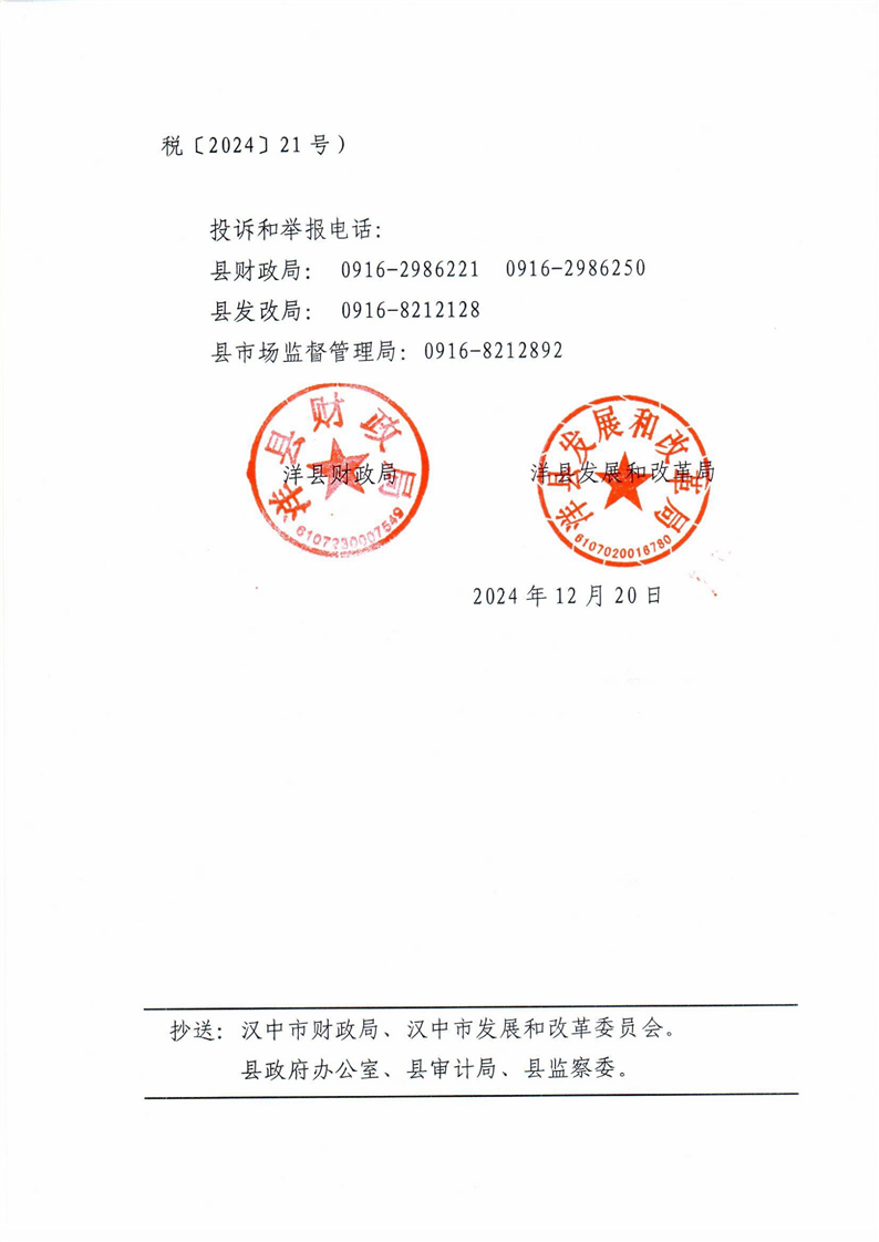 洋縣財(cái)政局 洋縣發(fā)展和改革局關(guān)于轉(zhuǎn)發(fā)漢中市財(cái)政局、漢中市發(fā)展和改革委《關(guān)于修訂全市行政事業(yè)性收費(fèi)和政府性基金目錄清單》的通知 洋財(cái)發(fā)【2024】125號(hào) |