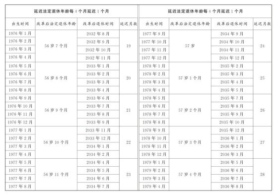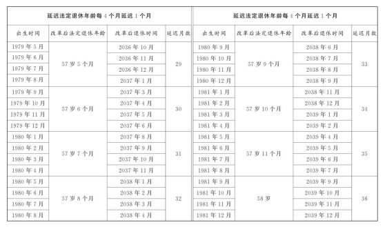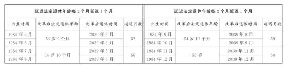 第一條 從2025年1月1日起,男職工和原法定退休年齡為五十五周歲的女職工,法定退休年齡每四個月延遲一個月,分別逐步延遲至六十三周歲和五十八周歲;原法定退休年齡為五十周歲的女職工,法定退休年齡每二個月延遲一個月,逐步延遲至五十五周歲。國家另有規定的,從其規定。