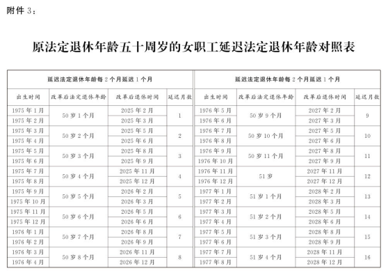 3.原法定退休年齡五十周歲的女職工延遲法定退休年齡對照表