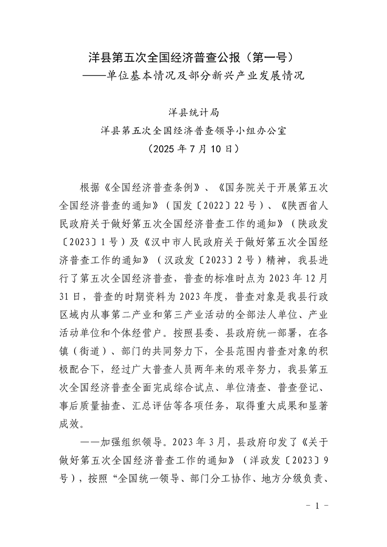 洋縣第五次全國經(jīng)濟普查公報(第一號)——單位基本情況及部分新興產(chǎn)業(yè)發(fā)展情況 |