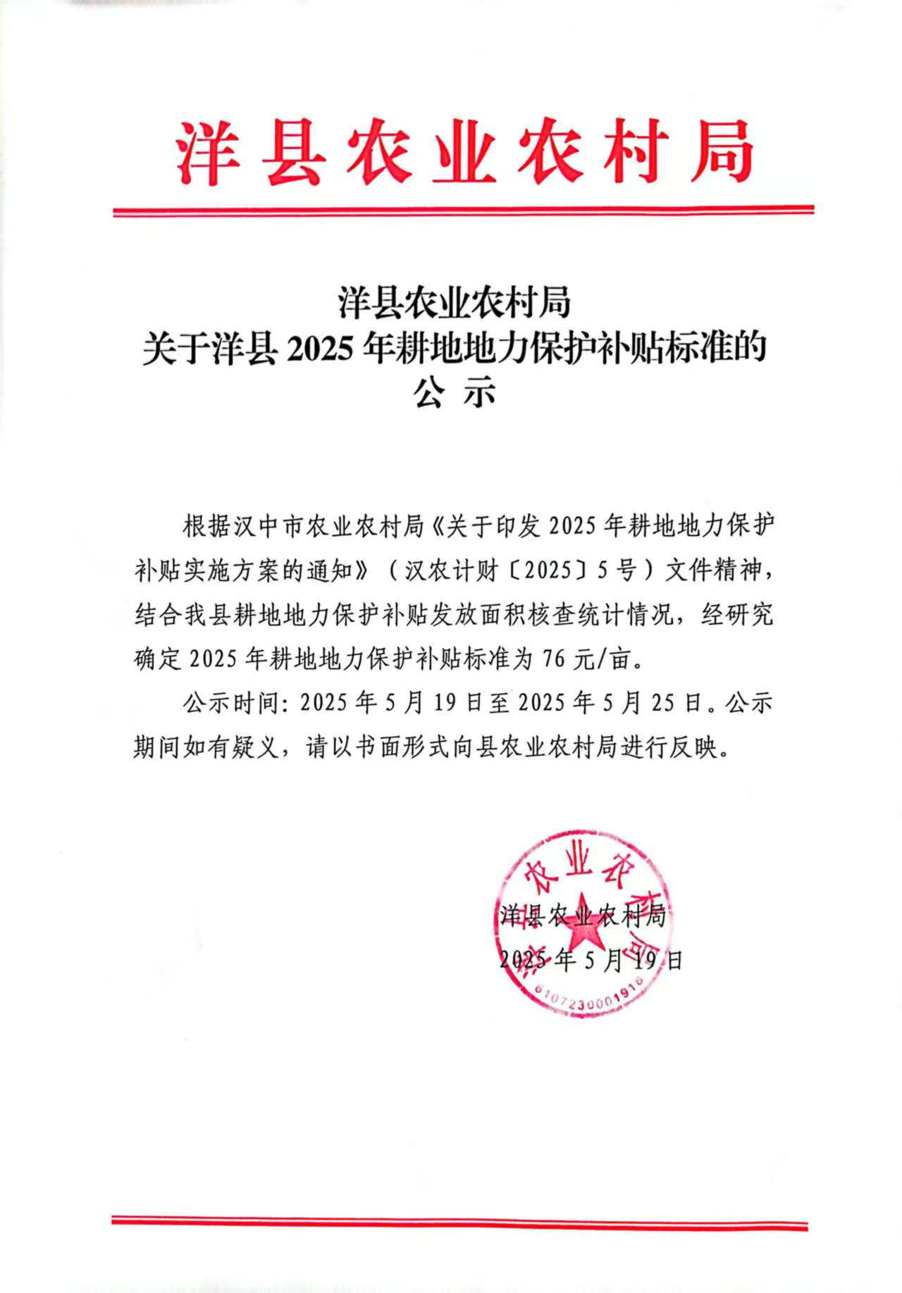 洋縣農業農村局關于洋縣2025年耕地地力保護補貼標準的公示