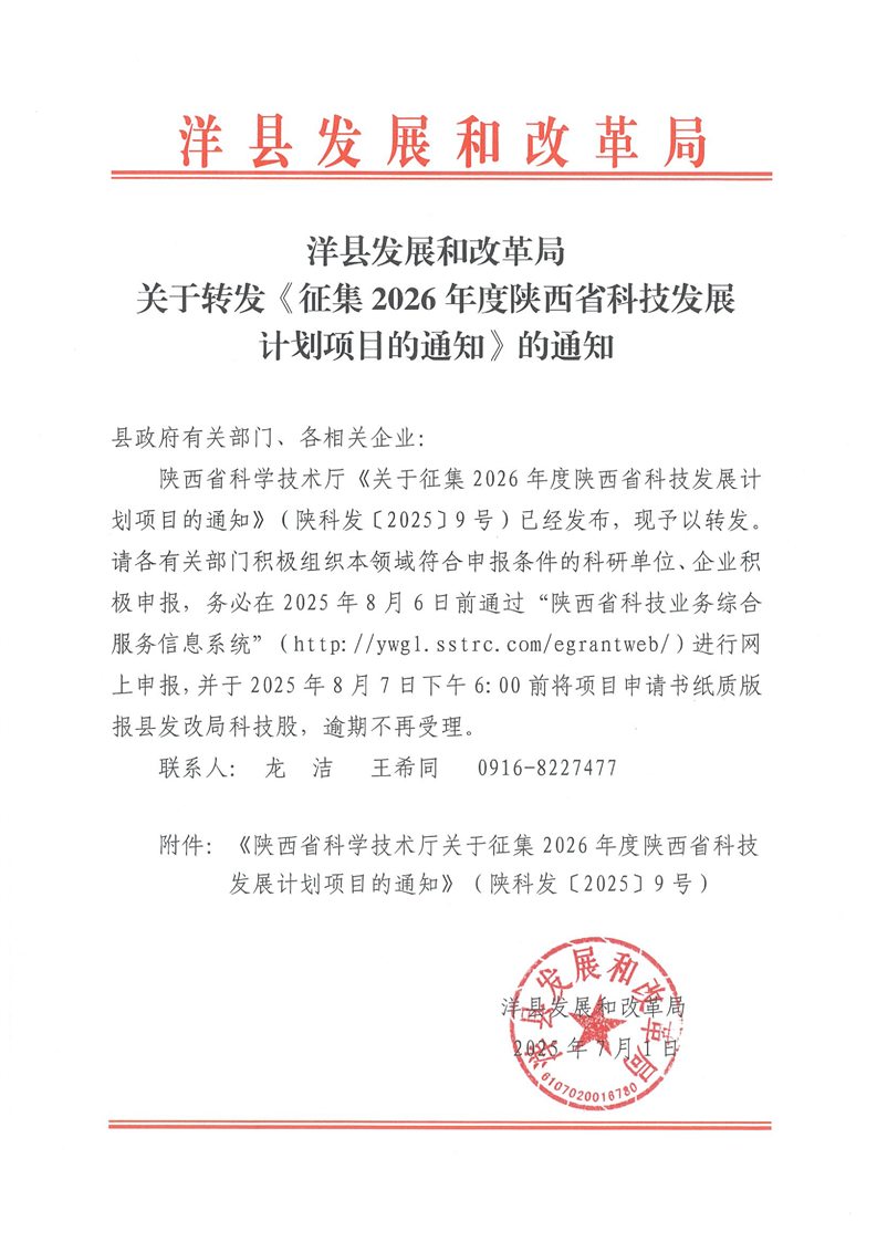 洋縣發展和改革局關于轉發《征集2026年度陜西省科技發展計劃項目的通知》的通知