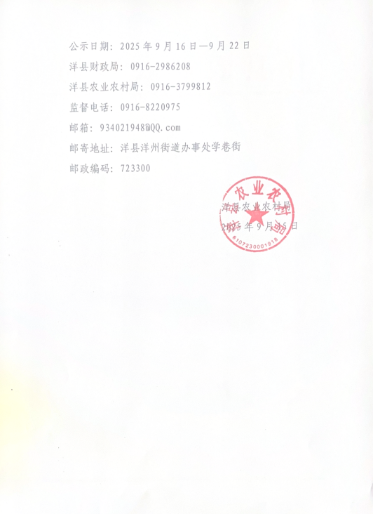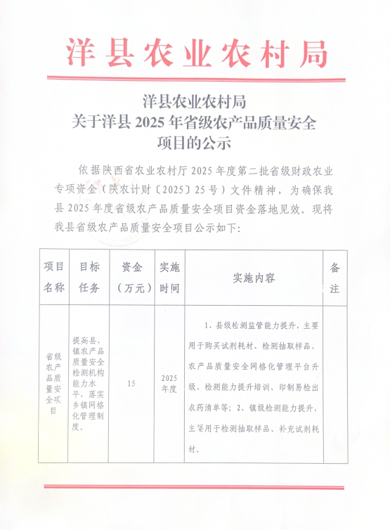 洋縣農(nóng)業(yè)農(nóng)村局關(guān)于洋縣2025年省級農(nóng)產(chǎn)品質(zhì)量安全項目的公示