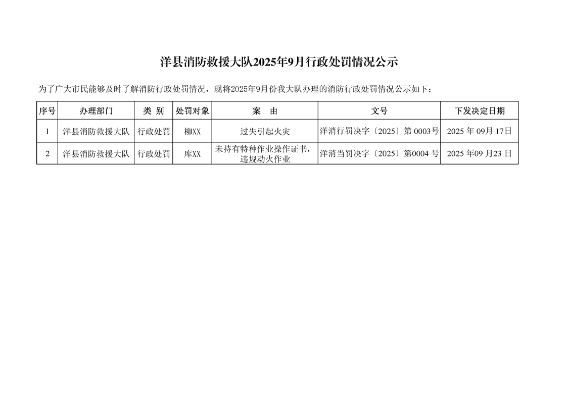 洋縣消防救援大隊2025年9月行政處罰情況公示