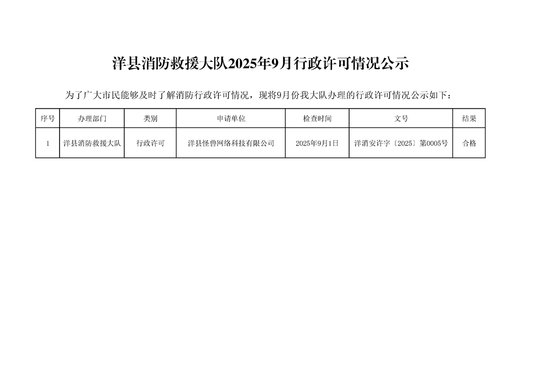洋縣消防救援大隊2025年9月行政許可情況公示