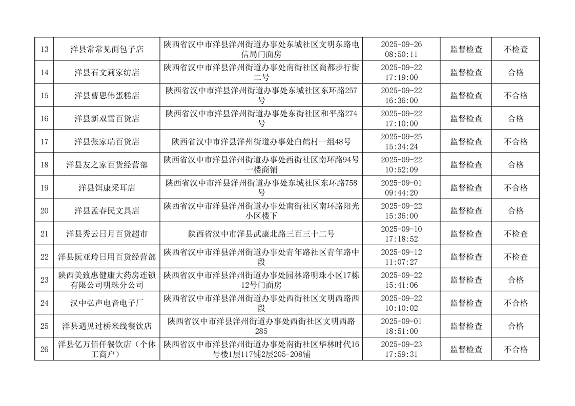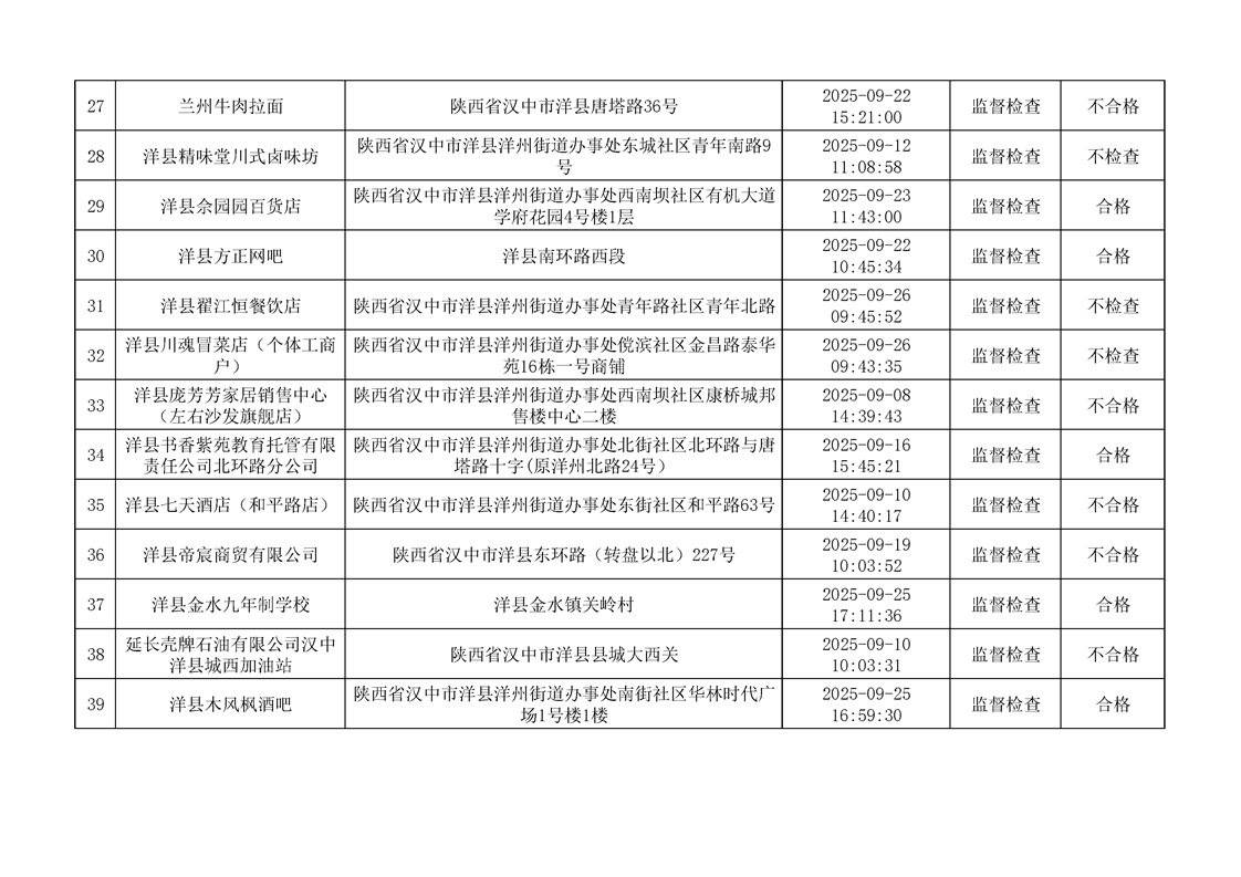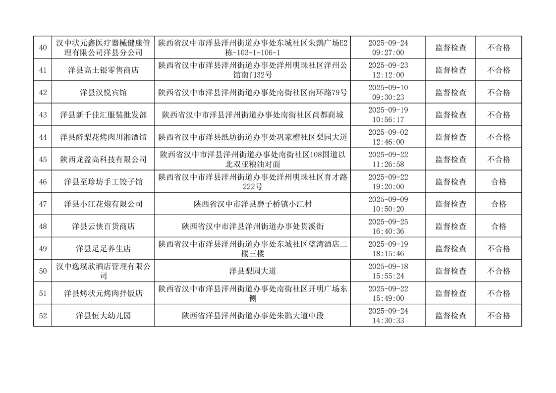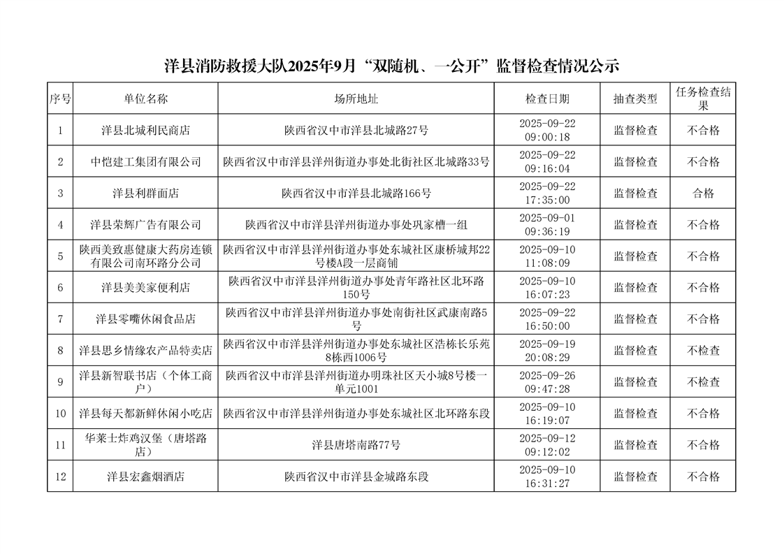 洋縣消防救援大隊2025年9月“雙隨機、一公開”監督檢查情況公示