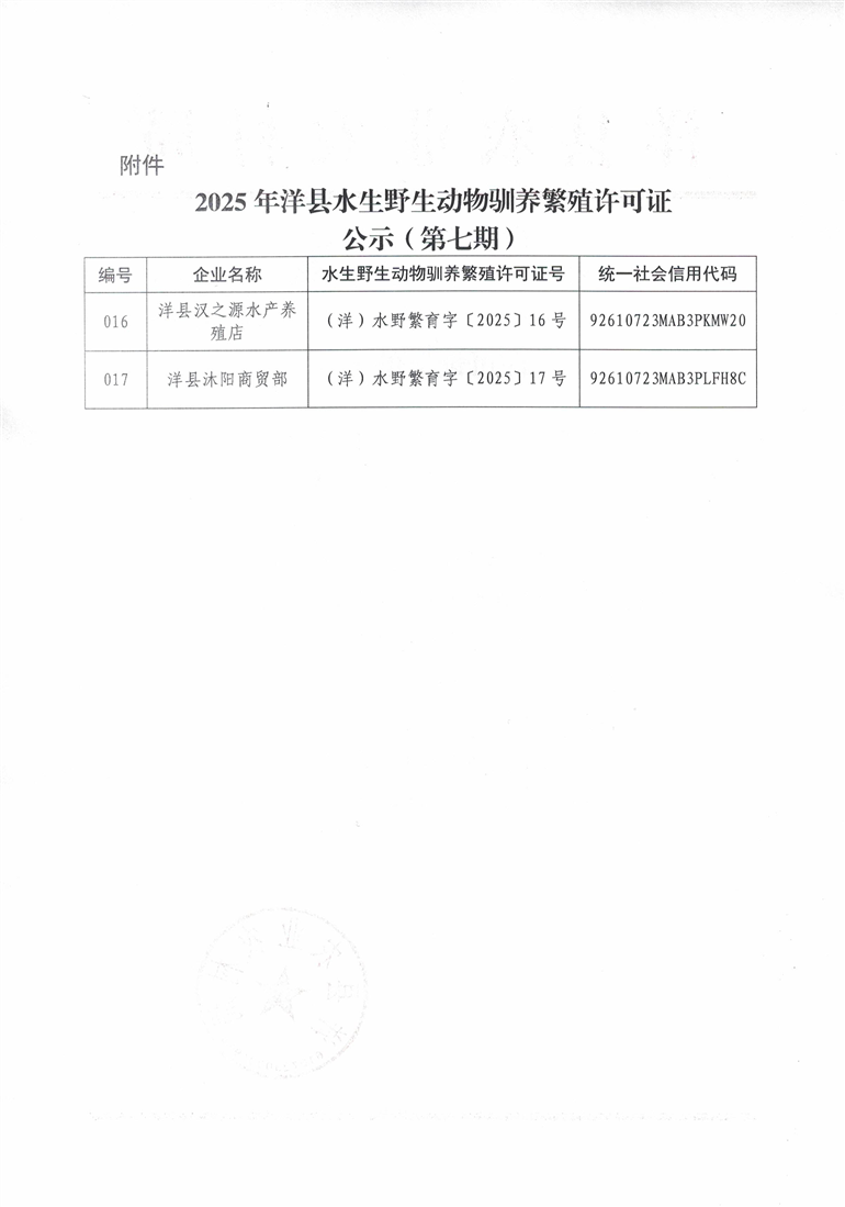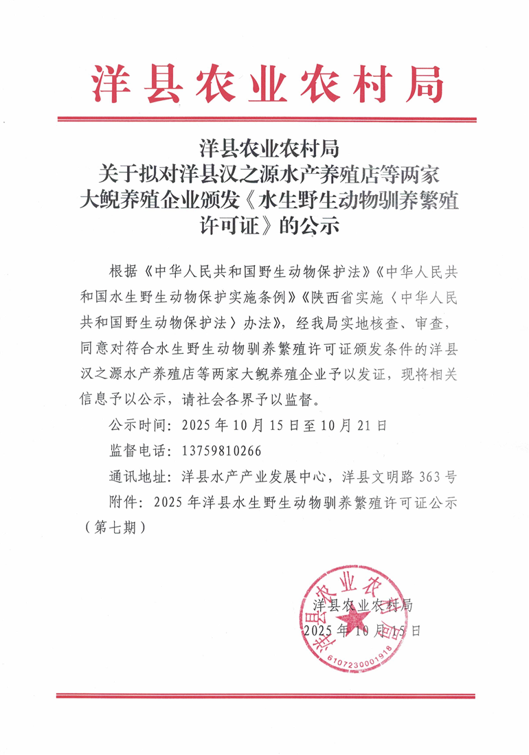關(guān)于擬對洋縣漢之源水產(chǎn)養(yǎng)殖店等兩家大鯢養(yǎng)殖企業(yè)頒發(fā)《水生野生動物馴養(yǎng)繁殖許可證》的公示