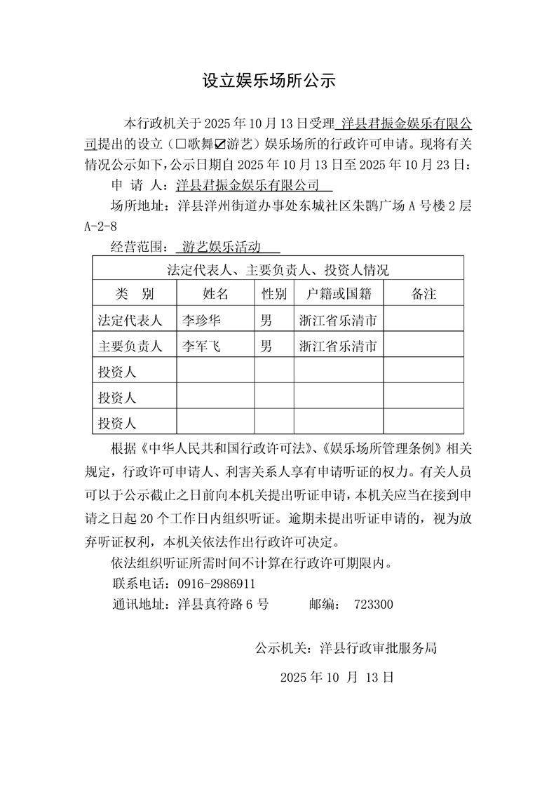 設立娛樂場所公示(洋縣君振金娛樂有限公司)