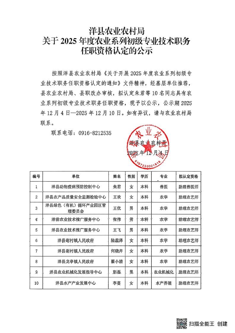 洋縣農業農村局關于2025年農業系列初級專業技術職務任職資格認定的公示