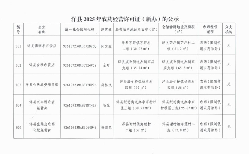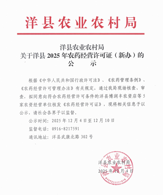 洋縣農(nóng)業(yè)農(nóng)村局擬向洋縣博潤豐農(nóng)資店等5家農(nóng)資經(jīng)營單位核發(fā)農(nóng)藥經(jīng)營許可證公示