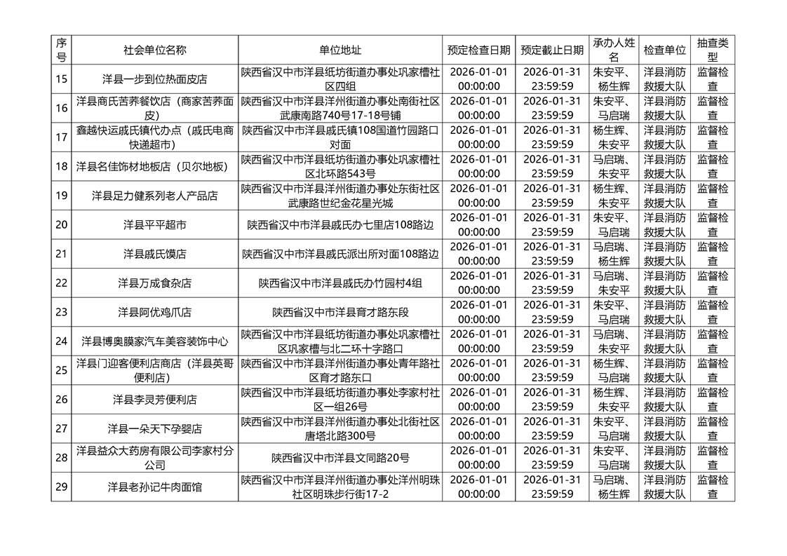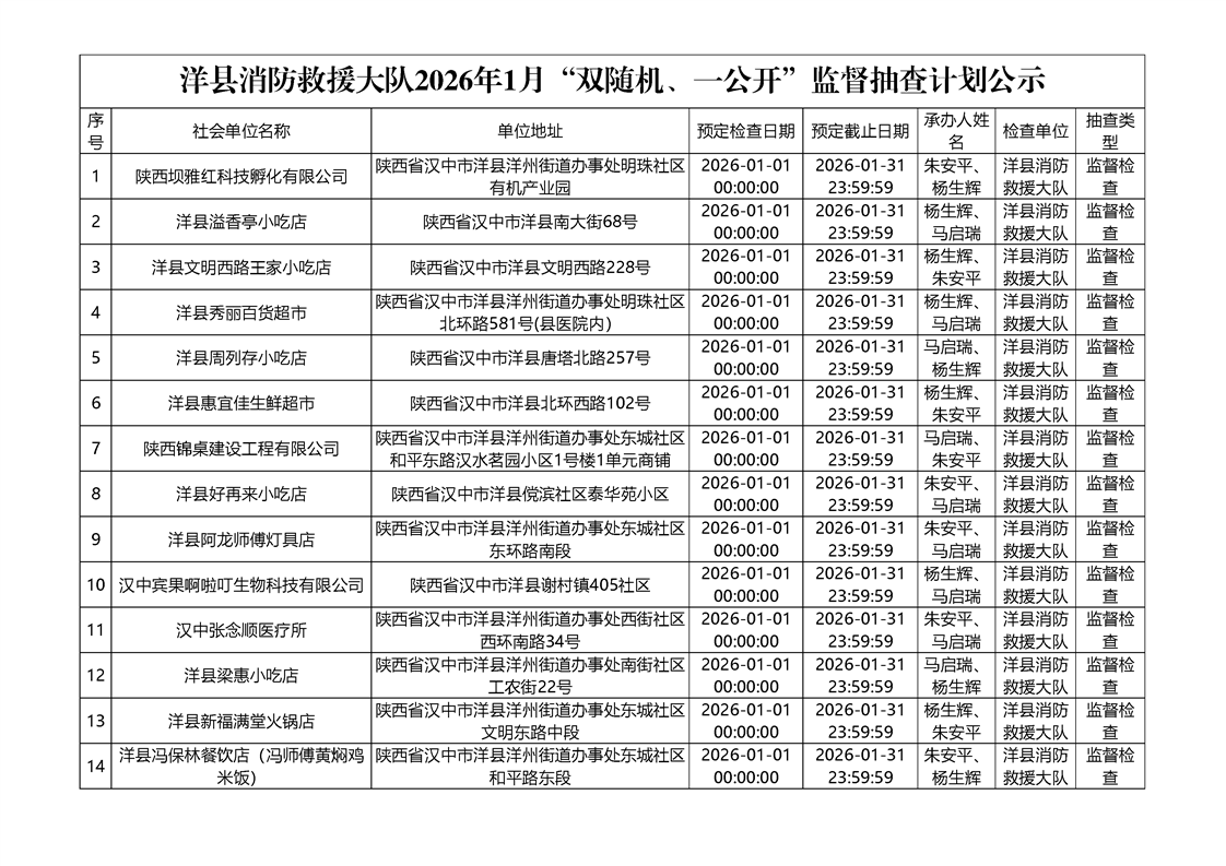 洋縣消防救援大隊2026年1月“雙隨機、一公開”監督抽查計劃公示