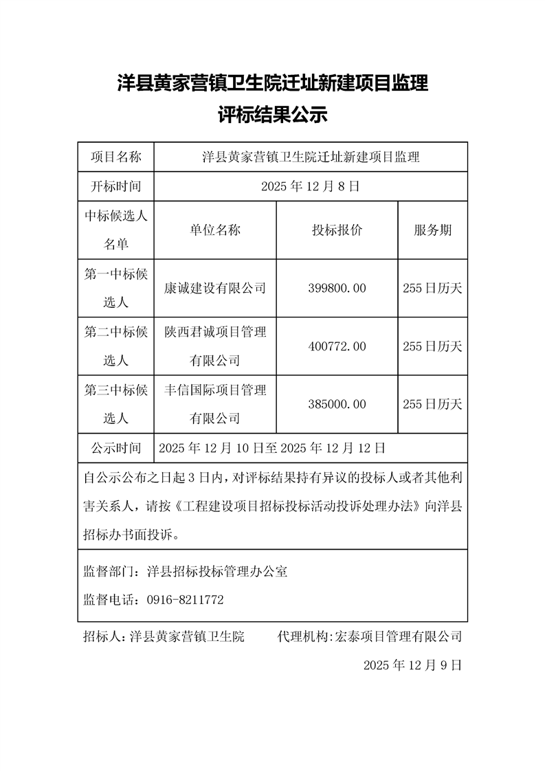 洋縣黃家營鎮(zhèn)衛(wèi)生院遷址新建項(xiàng)目監(jiān)理評標(biāo)結(jié)果公示