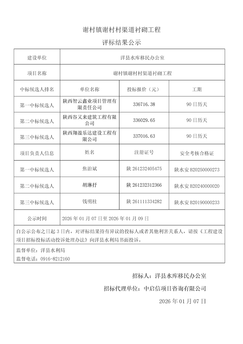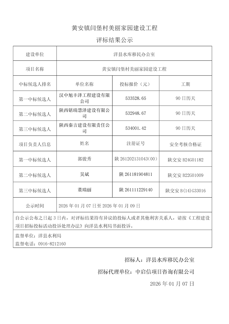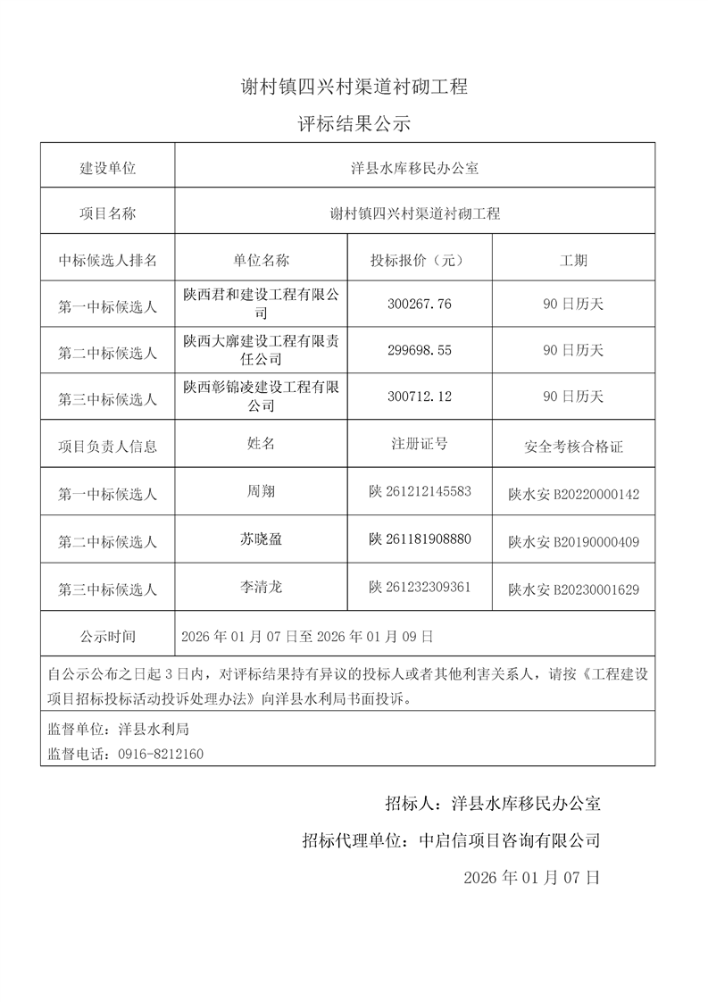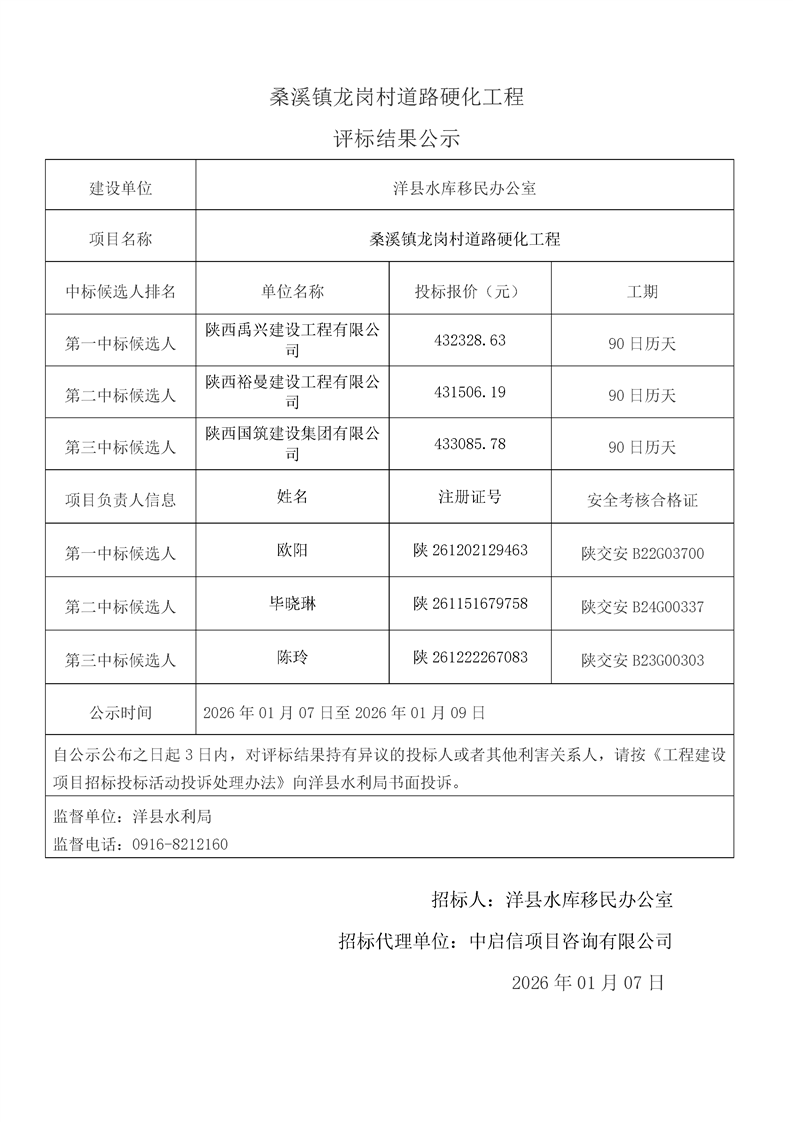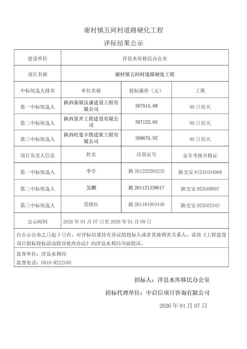 評標(biāo)結(jié)果公示(桑溪鎮(zhèn)龍崗村,謝村鎮(zhèn)五間村、東坡村,華陽鎮(zhèn)小華陽村、華陽村,黃金峽鎮(zhèn)楊莊村,黃家營鎮(zhèn)周家溝村,紙坊街道辦事處清涼村,黃家營鎮(zhèn)真符村道路硬化工程;溢水鎮(zhèn)花園村水毀道路防護(hù)工程;黃安鎮(zhèn)何家村白改黑工程;黃安鎮(zhèn)張堡村、閆堡村、樸樹村,槐樹關(guān)鎮(zhèn)茶坊村,洋州街道辦東咀村美麗家園建設(shè)工程;謝村鎮(zhèn)謝村村、四興村渠道襯砌工程;2025年第三批中央水庫移民扶持基金項(xiàng)目監(jiān)理服務(wù))