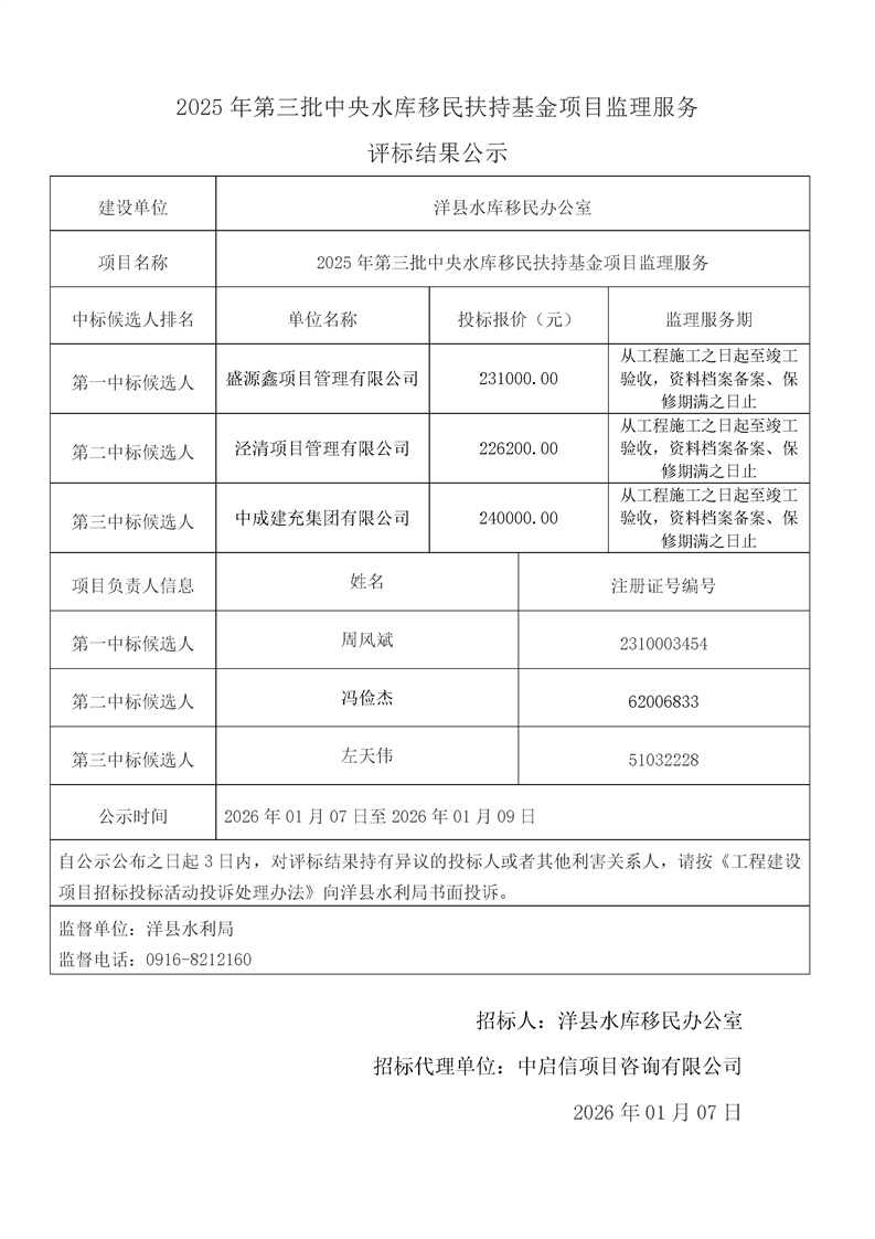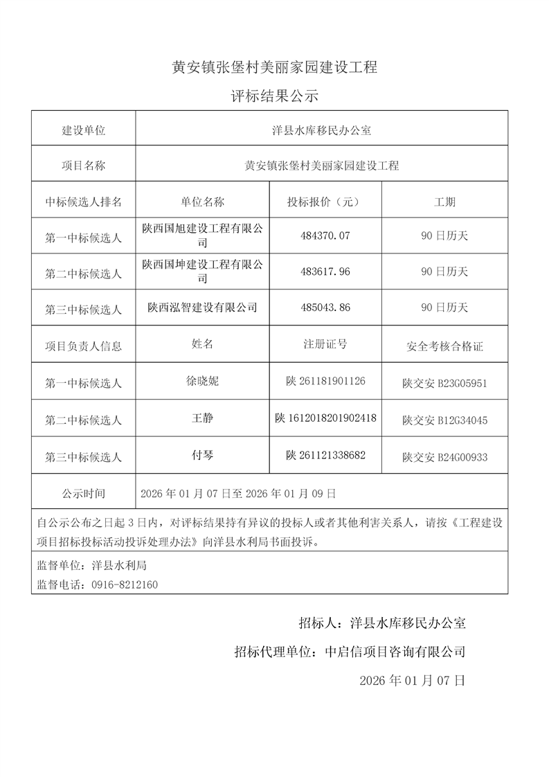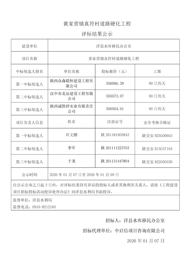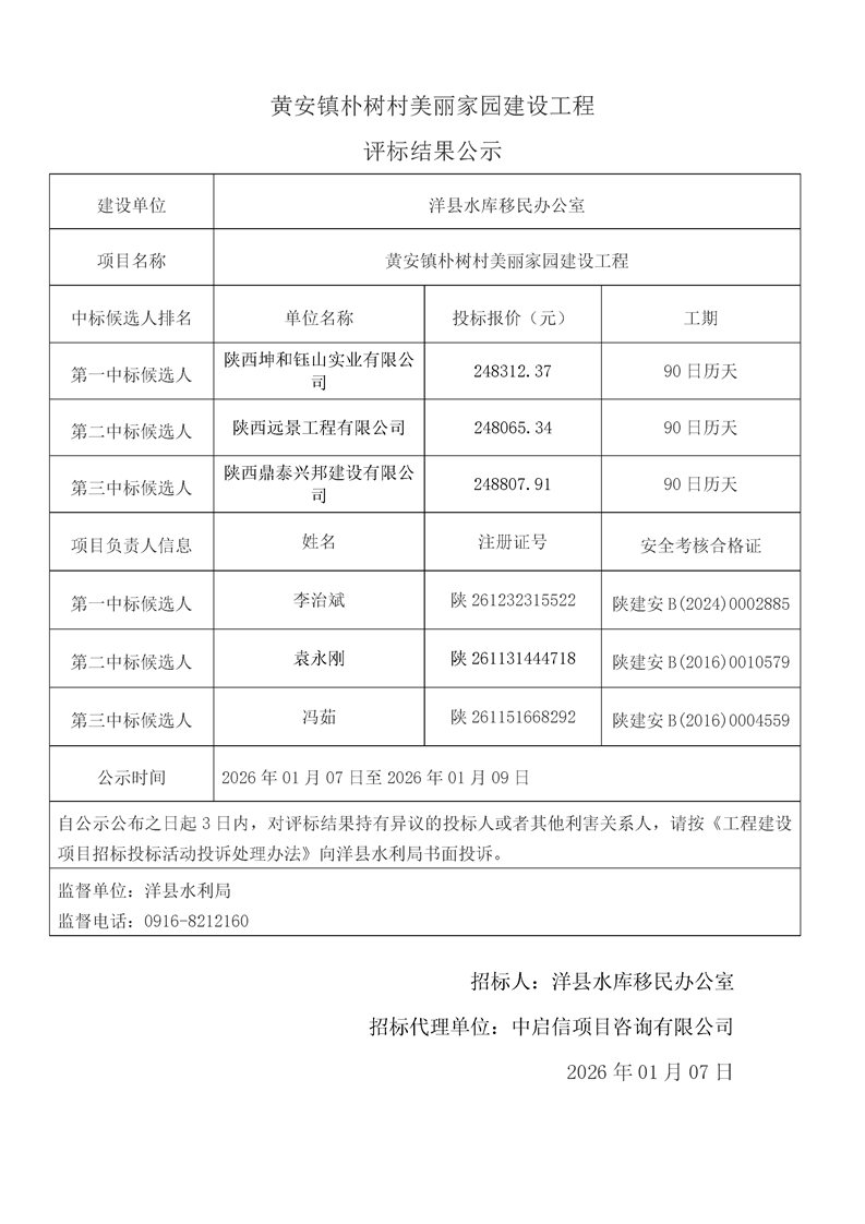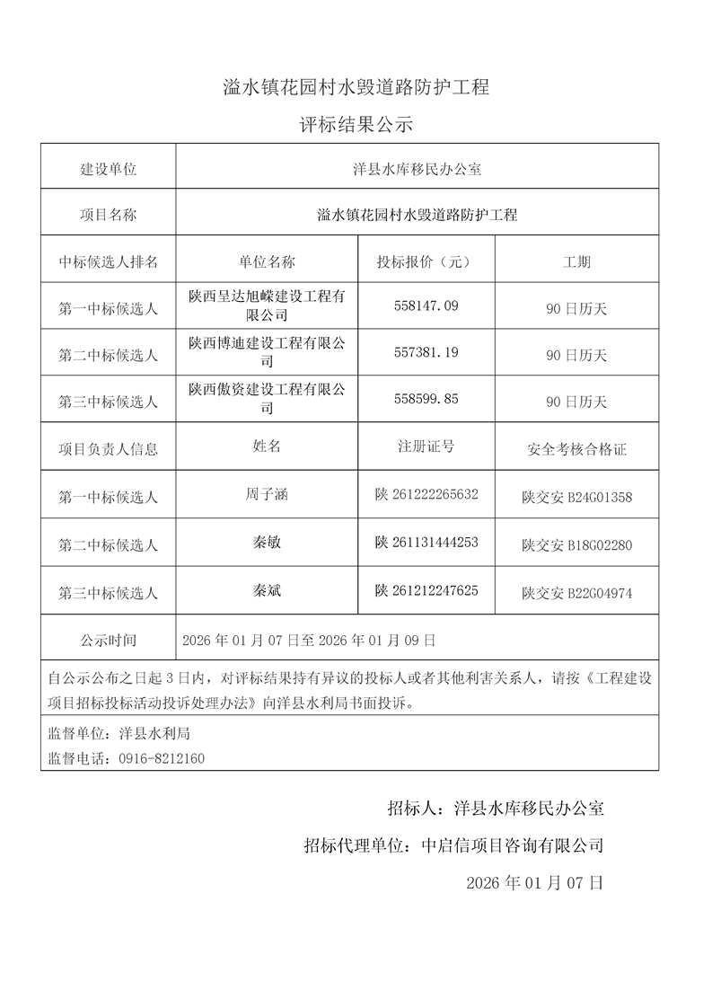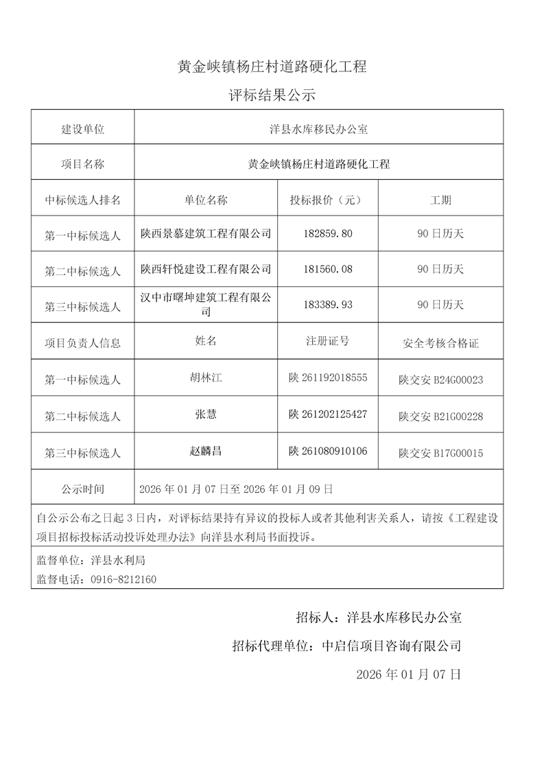 評標(biāo)結(jié)果公示(桑溪鎮(zhèn)龍崗村,謝村鎮(zhèn)五間村、東坡村,華陽鎮(zhèn)小華陽村、華陽村,黃金峽鎮(zhèn)楊莊村,黃家營鎮(zhèn)周家溝村,紙坊街道辦事處清涼村,黃家營鎮(zhèn)真符村道路硬化工程;溢水鎮(zhèn)花園村水毀道路防護(hù)工程;黃安鎮(zhèn)何家村白改黑工程;黃安鎮(zhèn)張堡村、閆堡村、樸樹村,槐樹關(guān)鎮(zhèn)茶坊村,洋州街道辦東咀村美麗家園建設(shè)工程;謝村鎮(zhèn)謝村村、四興村渠道襯砌工程;2025年第三批中央水庫移民扶持基金項(xiàng)目監(jiān)理服務(wù))