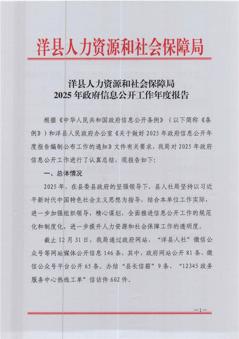 洋縣人力資源和社會保障局2025年政府信息公開工作年度報(bào)告